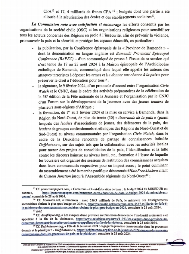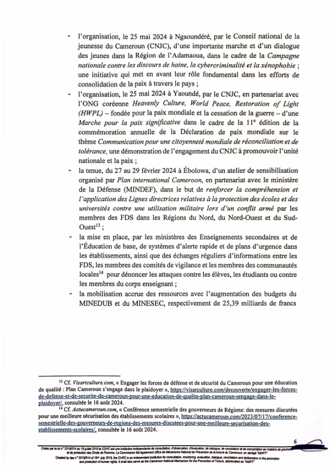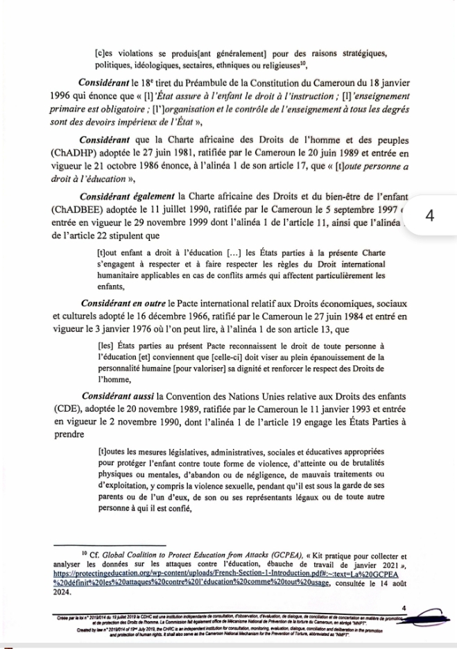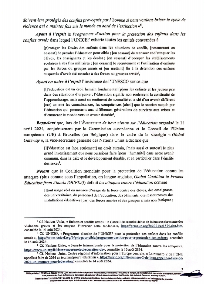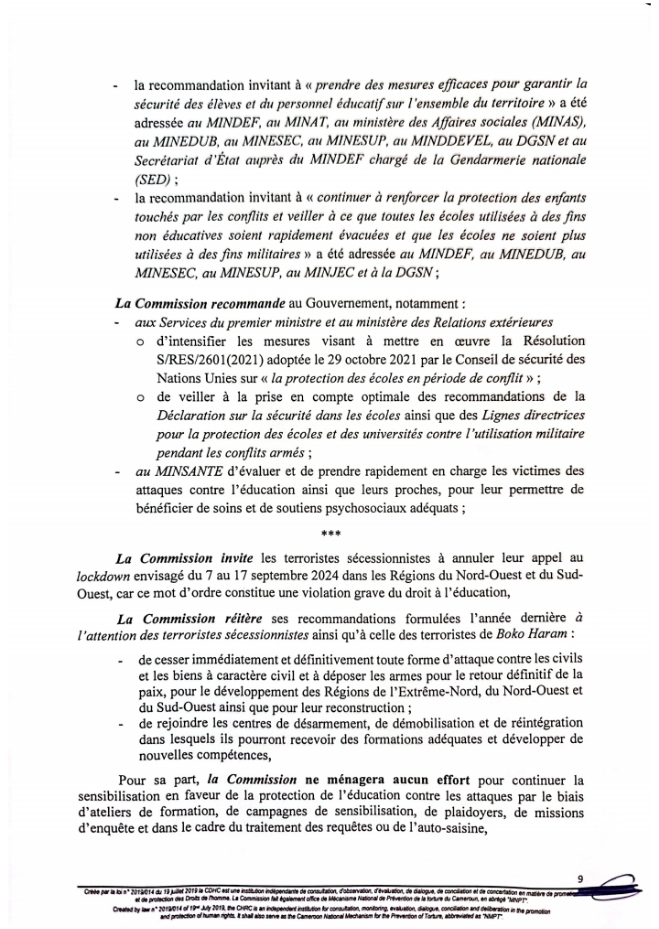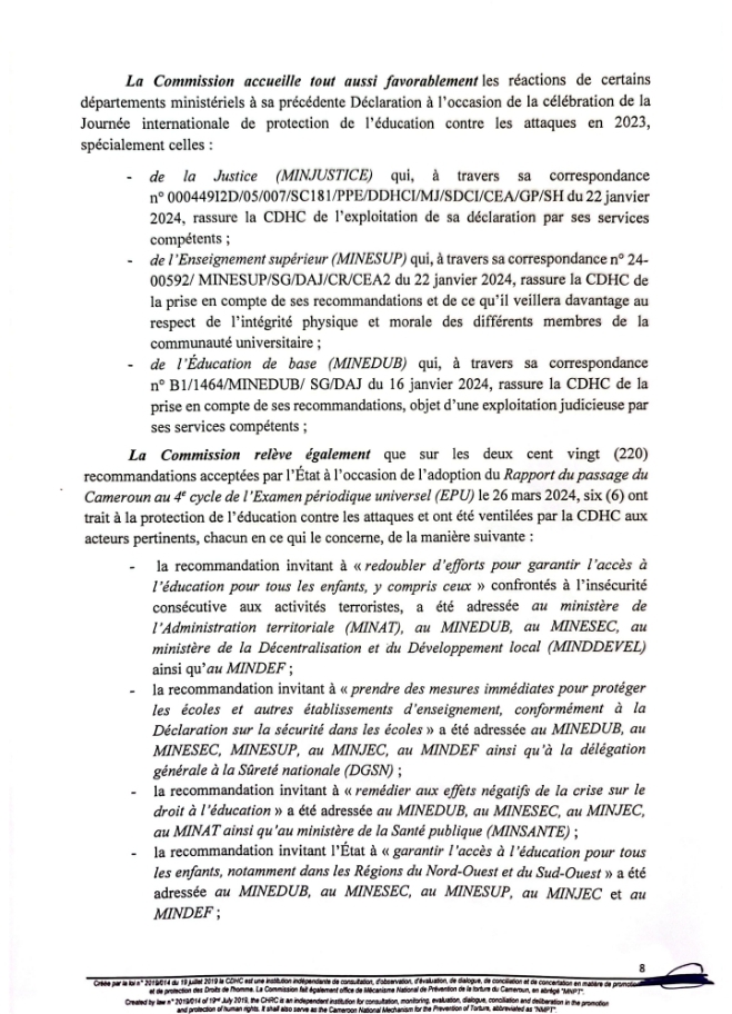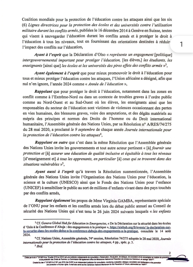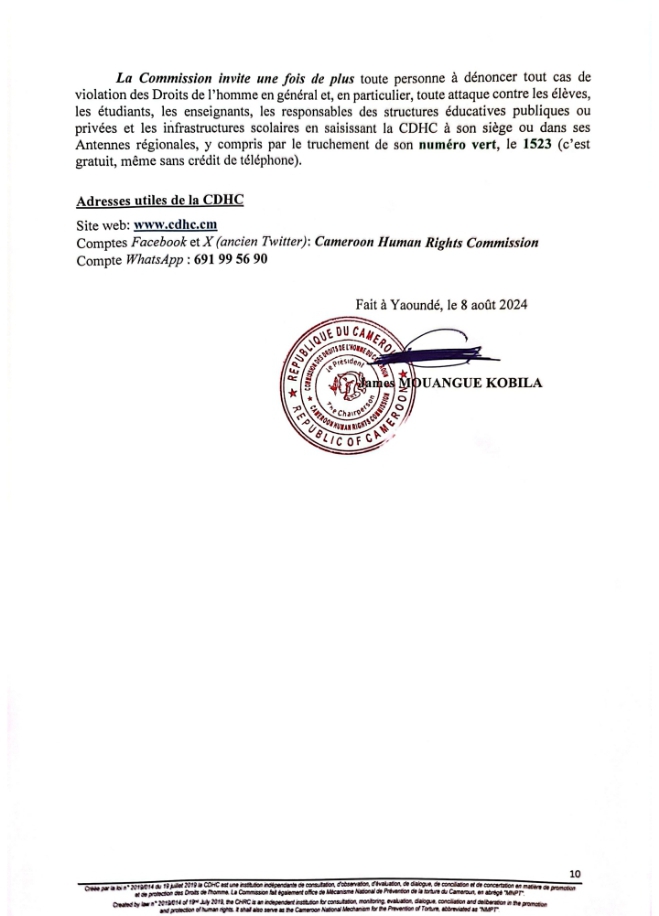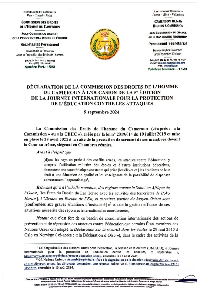 Ce lundi 9 Septembre 2024 marque la 5e édition de la Journée Internationale pour la Protection de l’Éducation contre les Attaques. À cette occasion, la Commission des Droits de l’Homme du Cameroun a rendu publique une déclaration.