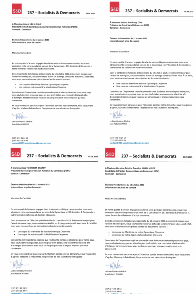 À un mois du scrutin, la Dynamique 237-Socialists & Democrats multiplie les démarches pour fédérer les 11 candidats de l’opposition. Sous la Coordination de Mr Jean Robert Wanko, des correspondances ont été adressées aux différents leaders afin d’engager un Dialogue constructif sur les enjeux majeurs et d’explorer les perspectives d’un programme consensus et d’un candidat commun pour le Cameroun.