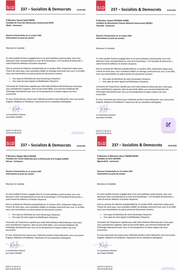 Le Mouvement citoyen transpartisan « 237 – Socialists & Democrats », conduit par son coordinateur général Jean Robert Wanko, a rendu public un manifeste ambitieux appelant les 11 Candidats de l’opposition à la présidentielle du 12 octobre 2025 à l’unité de l’opposition et à une mobilisation populaire en vue de l’élection présidentielle du 12 octobre 2025.