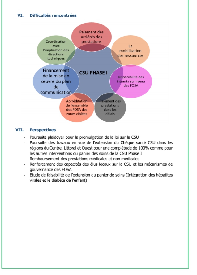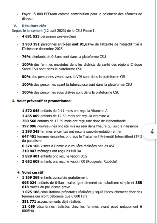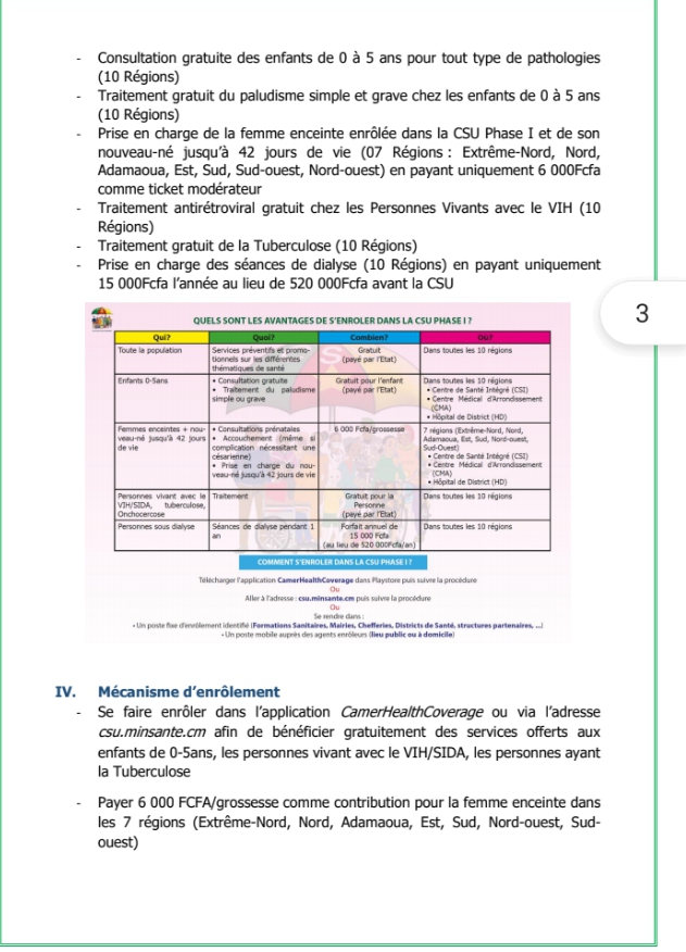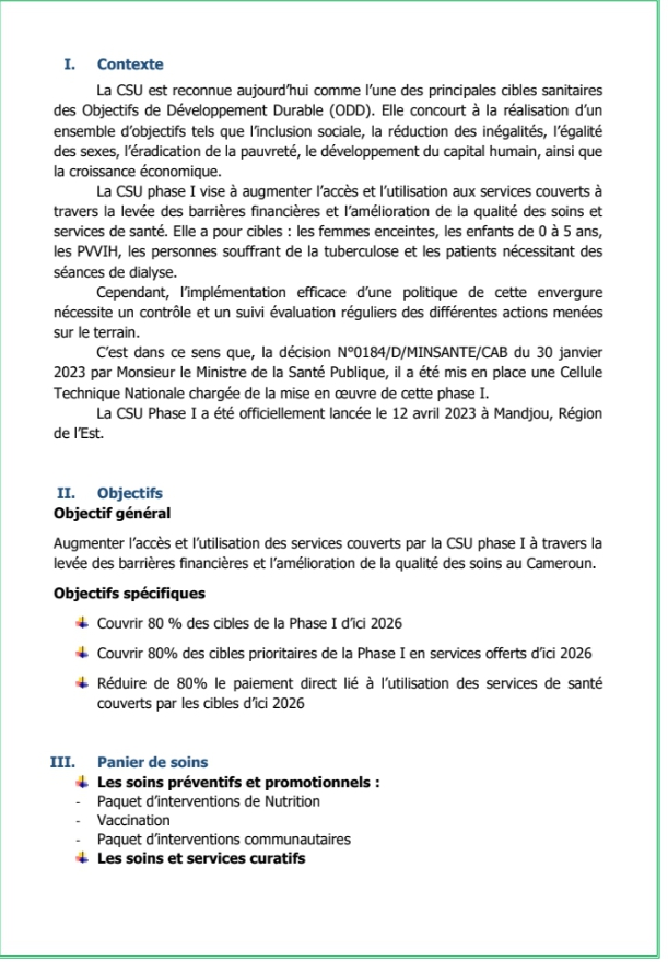 Le document en question, met en exergue les avancées enregistrées dans la mise en œuvre de ce projet ambitieux porté par le Président de la République son Excellence Mr PAUL BIYA , destiné à garantir l’accès équitable aux soins de santé pour tous les Camerounais.