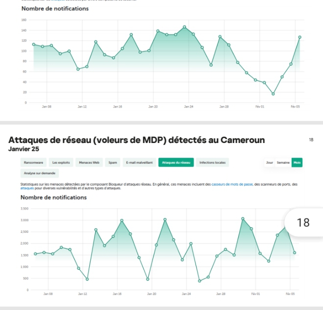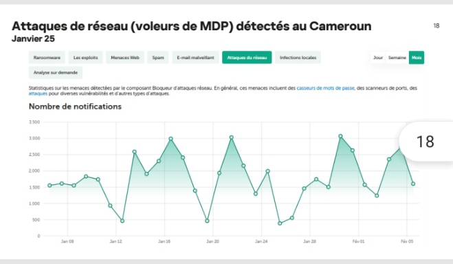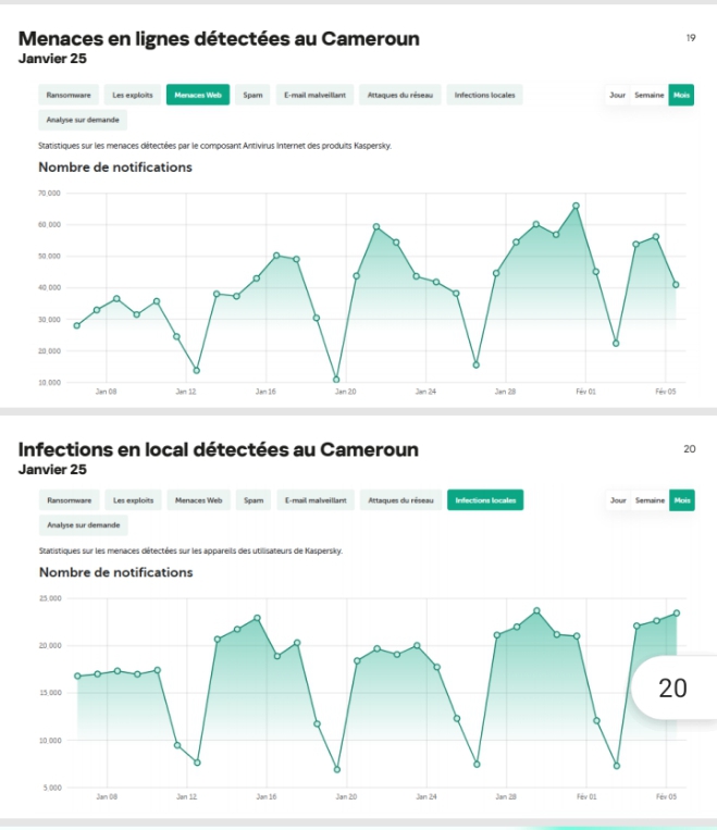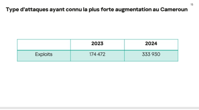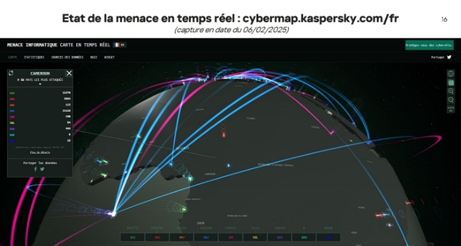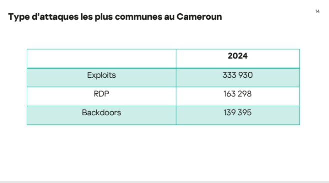 En 2023-2024, le Cameroun enregistre des menaces à hauteur de 19 millions, un chiffre global stable mais avec une répartition différente des types d’attaques. Tandis que les menaces locales diminuent (11.99 millions en 2024 contre 14.05 millions en 2023), les menaces via le web connaissent une hausse significative (7.42 millions en 2024 contre 5.71 millions en 2023), une tendance qui traduit l’évolution des vecteurs d’attaque. M. Pascal Naudin a exprimé ses préoccupations face à ces chiffres alarmants, soulignant la nécessité d’une vigilance accrue et de mesures préventives adaptées.