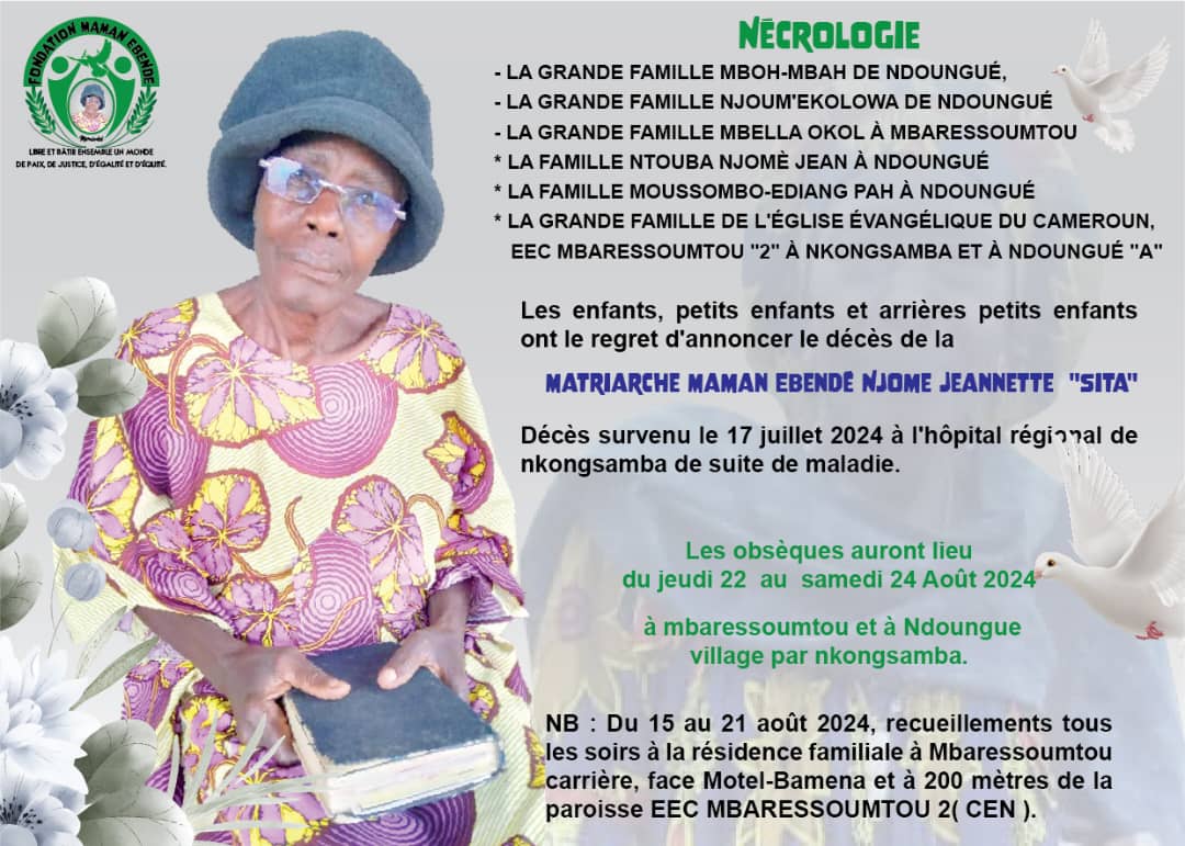 Les obsèques de la Matriarche Ebendé Njomé Jeannette, connue sous le nom de « Sita« , se dérouleront du jeudi 22 au samedi 24 août 2024, à Mbaressoumtou et à Ndoungué Village.