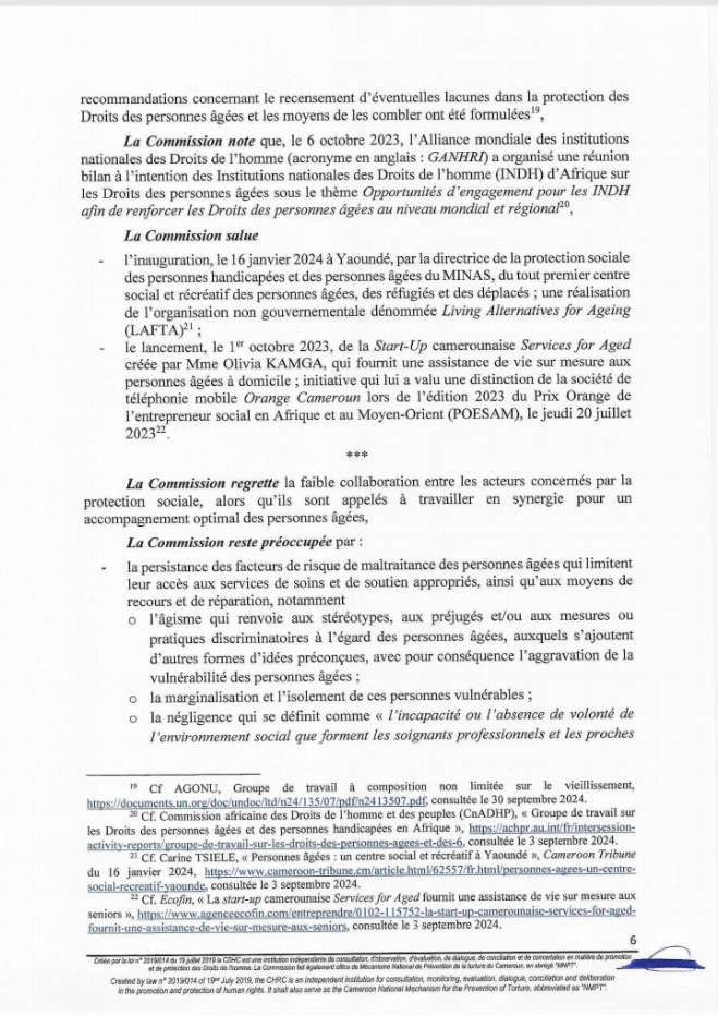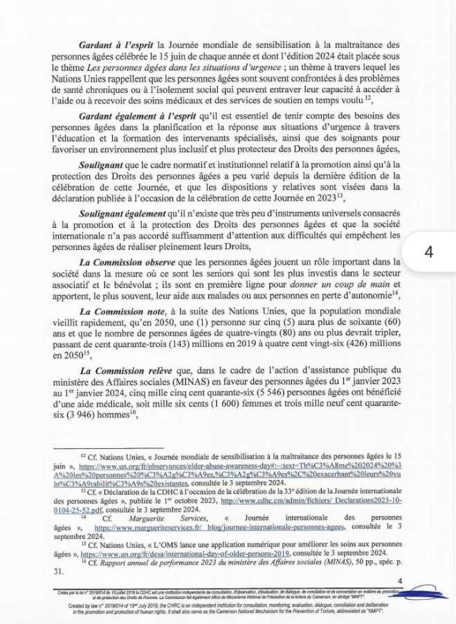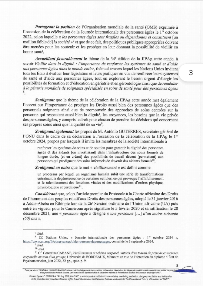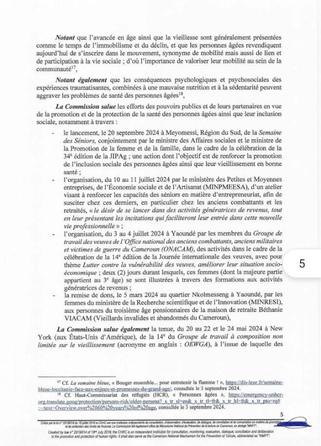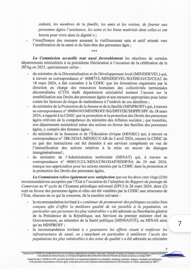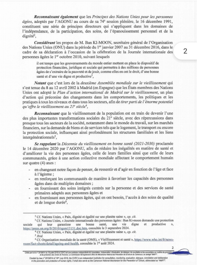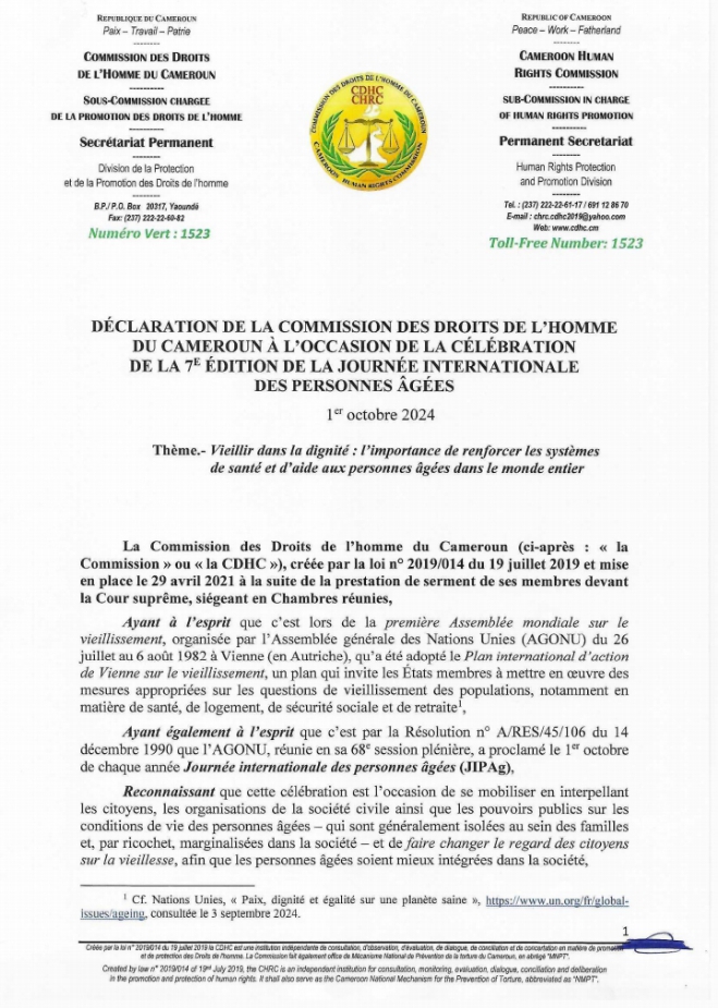 À l’occasion de la 7e édition de la Journée Internationale des Personnes Âgées, qui s’est célébrée ce 1er Octobre 2024 , la Commission des Droits de l’Homme du Cameroun ( CDHC) a réaffirmé son engagement indéfectible en faveur des droits des aînés, soulignant l’importance de leur permettre de vieillir dans la dignité.