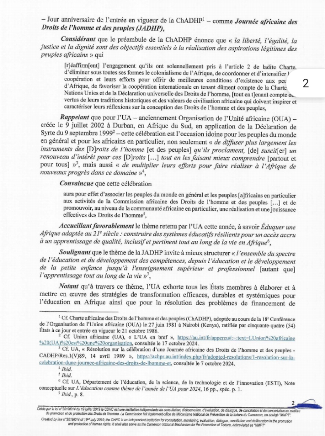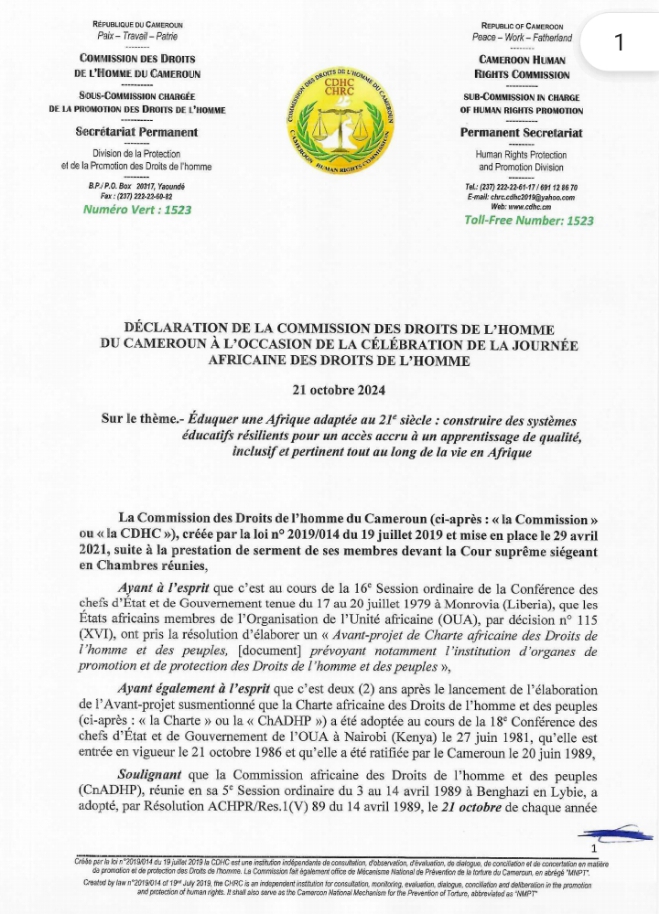 En ce 21 Octobre 2024, la Commission des Droits de l’Homme du Cameroun (CDHC) se joint à l’ensemble des peuples africains pour célébrer la Journée Africaine des Droits de l’Homme et des Peuples, un événement marquant consacré à la promotion et à la protection des droits humains sur le continent.