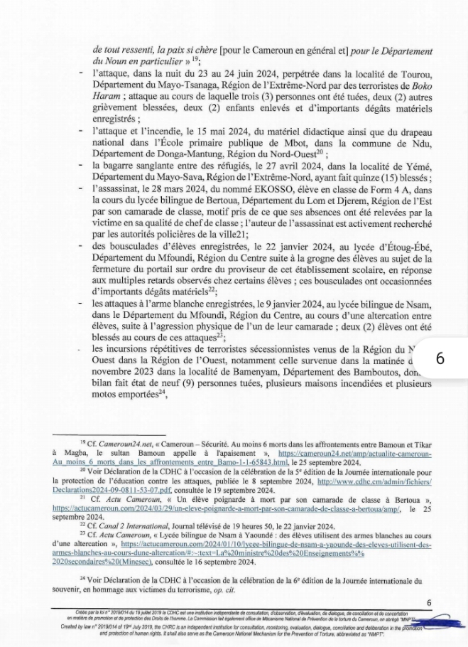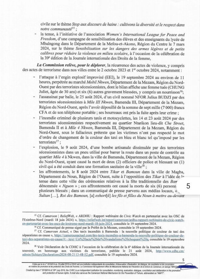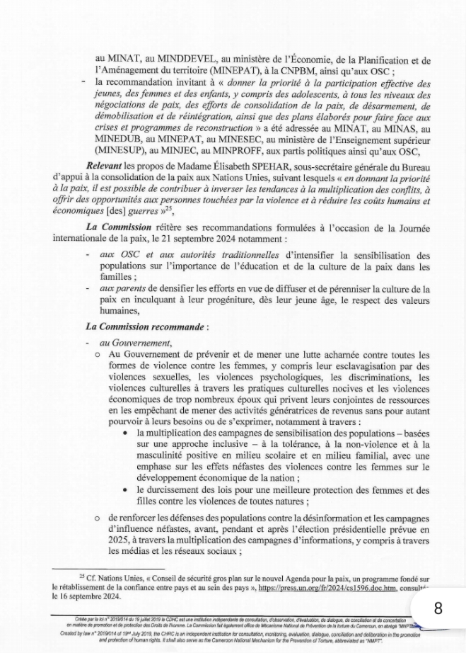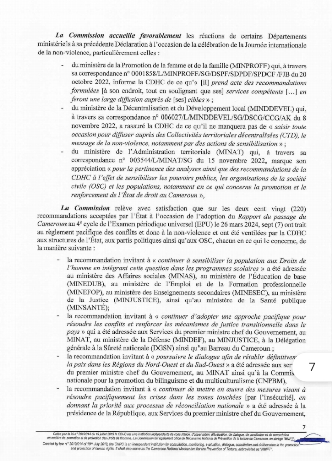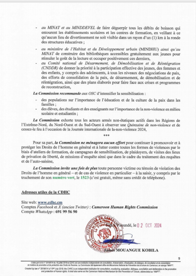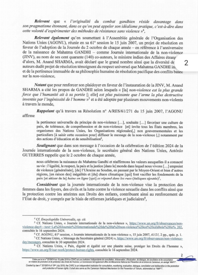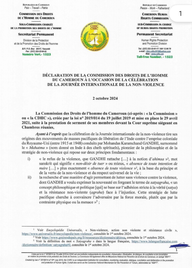 La Commission des Droits de l’Homme du Cameroun (CDHC) s’associe à la communauté internationale pour célébrer, ce mercredi 2 octobre 2024, la Journée Internationale de la Non-Violence, une journée dédiée à la promotion de la paix, du dialogue et de la tolérance, valeurs essentielles au maintien de la cohésion sociale et au développement harmonieux des nations.