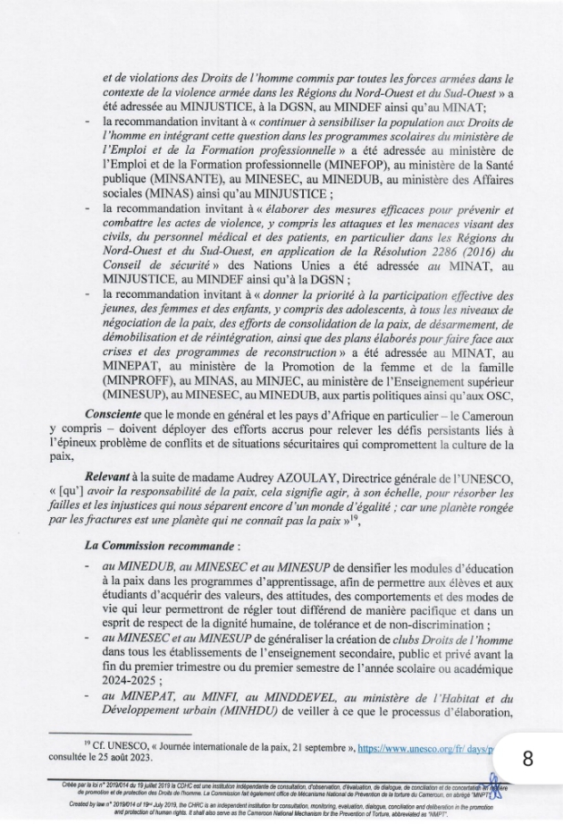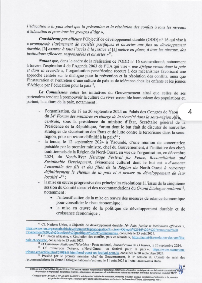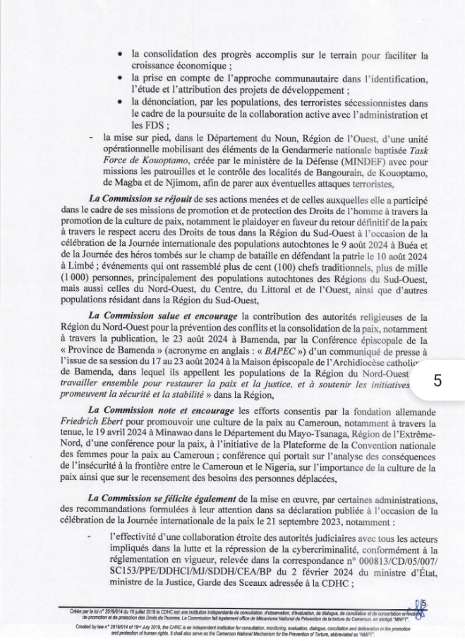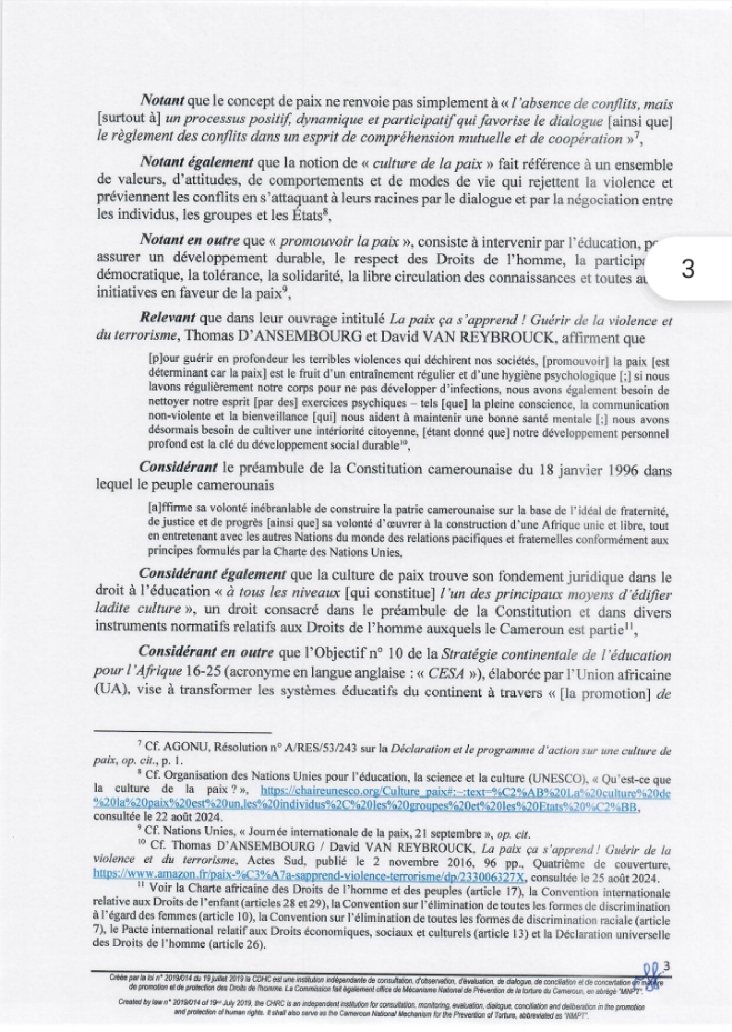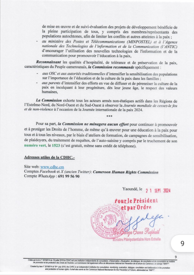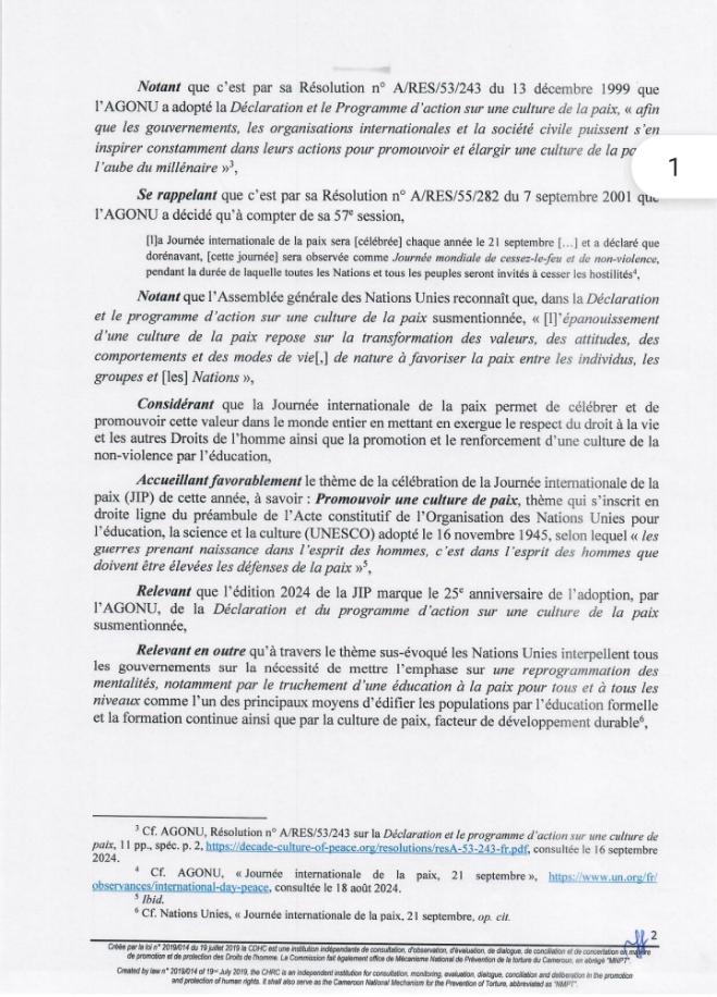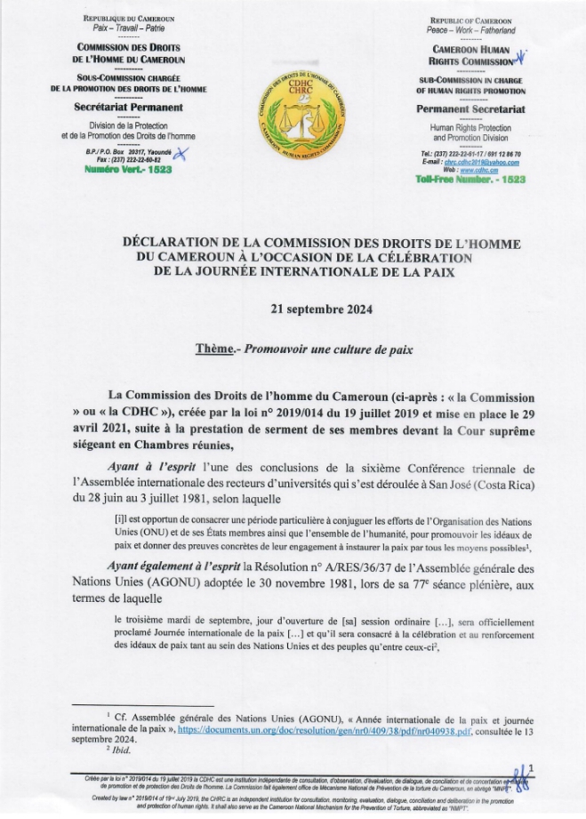 Ce Samedi 21 Septembre 2024, la Commission des Droits de l’Homme du Cameroun (CDHC) a rendu public une déclaration pour célébrer la Journée Internationale de la Paix. Sous le thème « Promouvoir une culture de paix« , cette déclaration souligne l’importance de la paix et de la cohésion sociale dans la société camerounaise.