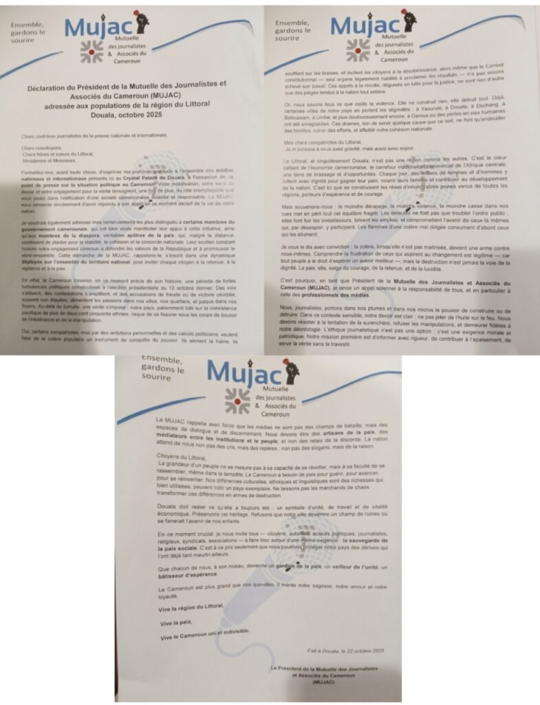 S’adressant particulièrement à la région du Littoral, le président de la MUJAC a souligné que Douala, cœur économique du pays, doit rester un symbole d’unité et de vitalité. « Chaque citoyen, acteur politique ou religieux, journaliste ou syndicaliste doit devenir un gardien de la paix et un bâtisseur d’espérance », a-t-il conclu.