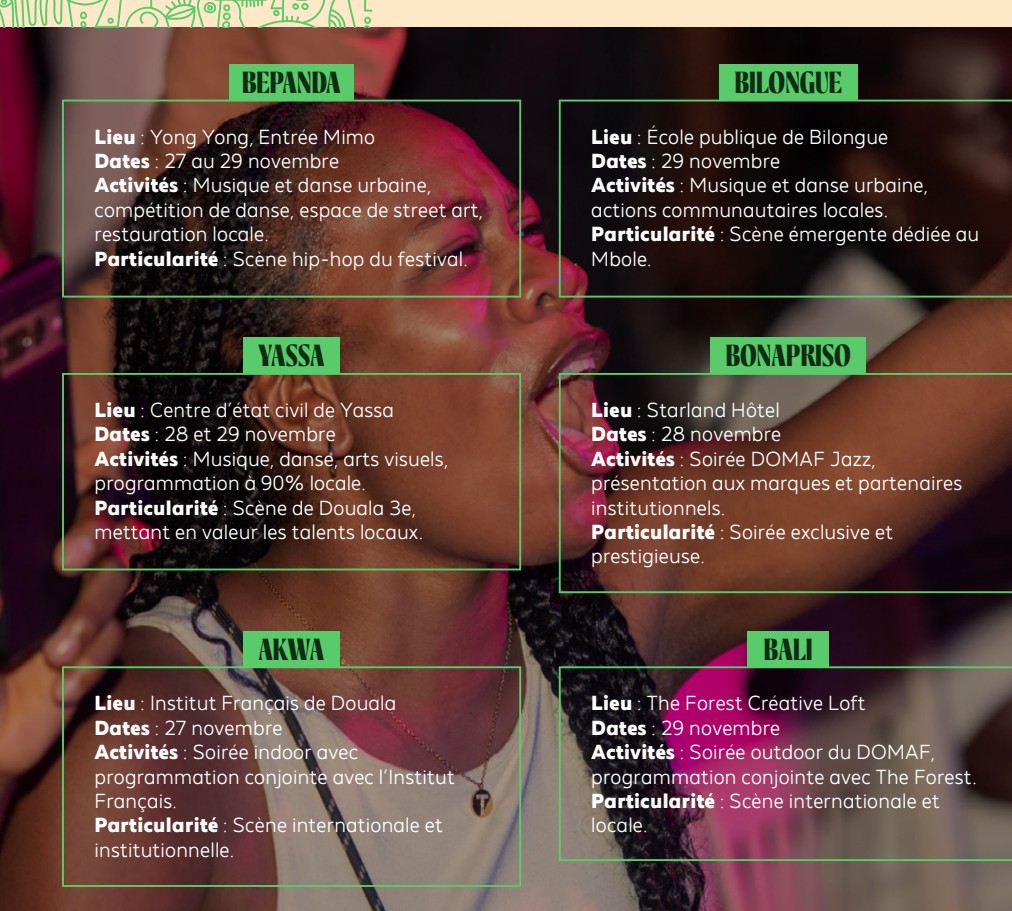 Le DOMAF 2025 déploiera ses activités sur 20 lieux choisis, dont le stade de Bonamoussadi (site principal), Starland Hotel à Bonapriso, The Forest Creative Loft à Bali, l’IFC à Akwa, Bilonguè, Japoma, Bonaberi et Nkongmondo. Plus de 25 000 visiteurs sont attendus sur quatre jours.