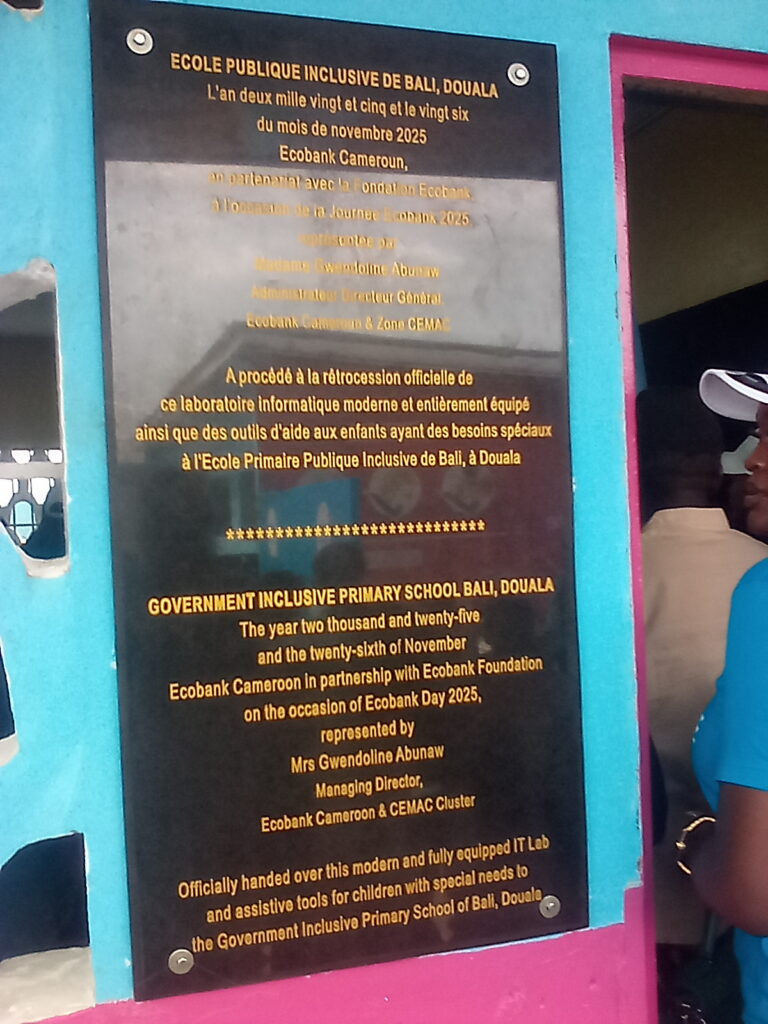 À l’occasion de ses 40 ans et de l’Ecobank Day 2025, Ecobank Cameroun a remis, ce mercredi 26 novembre 2025, une salle informatique moderne et adaptée à l’École Publique Inclusive de Bali. La cérémonie a été présidée par le Secrétaire général auprès des services du Gouverneur dû Littoral, Mr Aboubakary Haman TCHIOUTO, en présence de la Directrice Générale Mme Gwendoline Abunaw, Administratrice Directrice Générale d’Ecobank Cameroun et Zone Cemac.