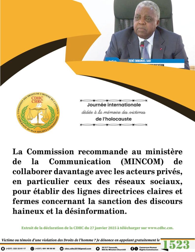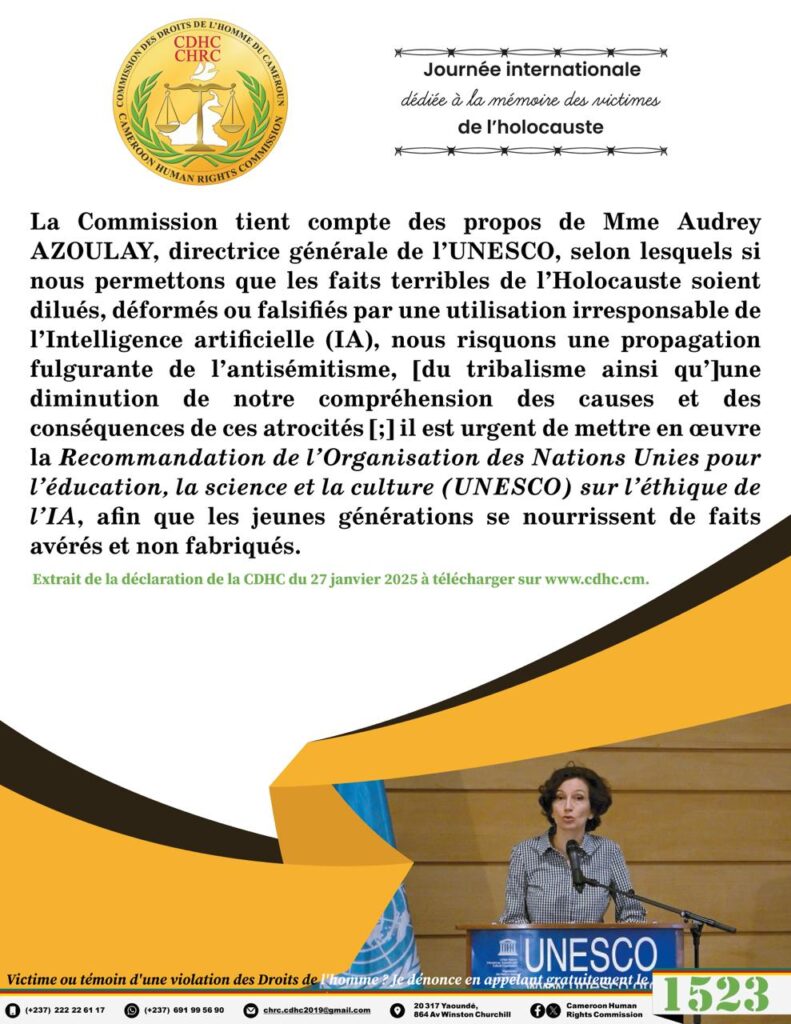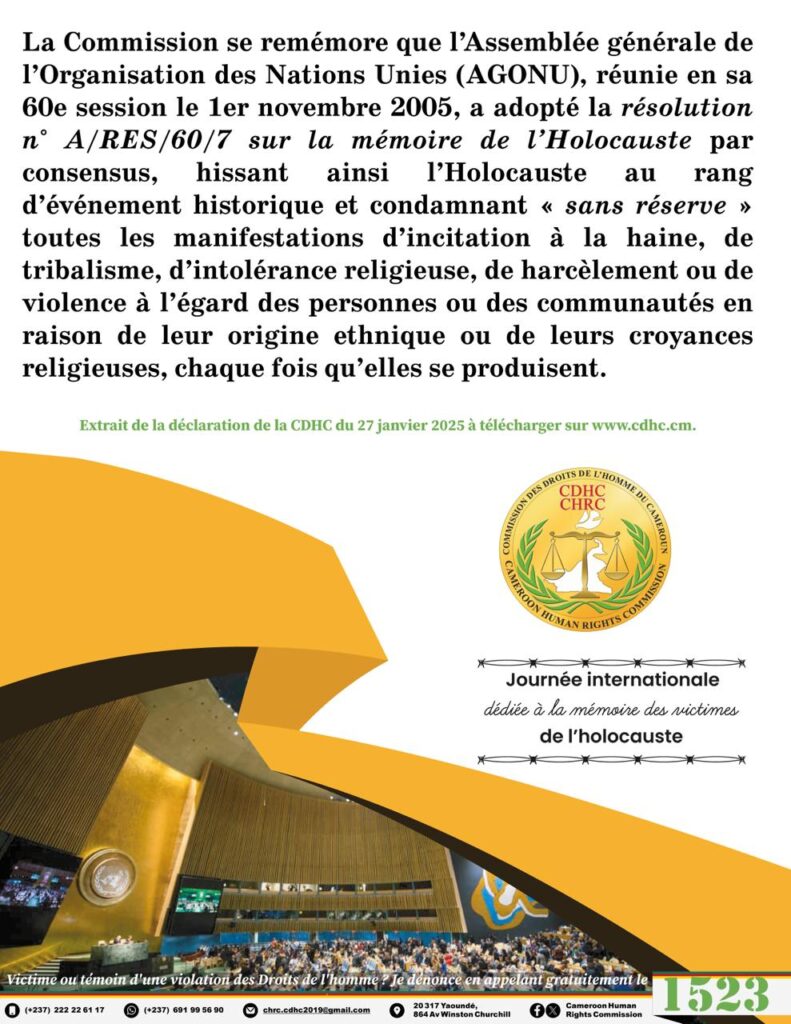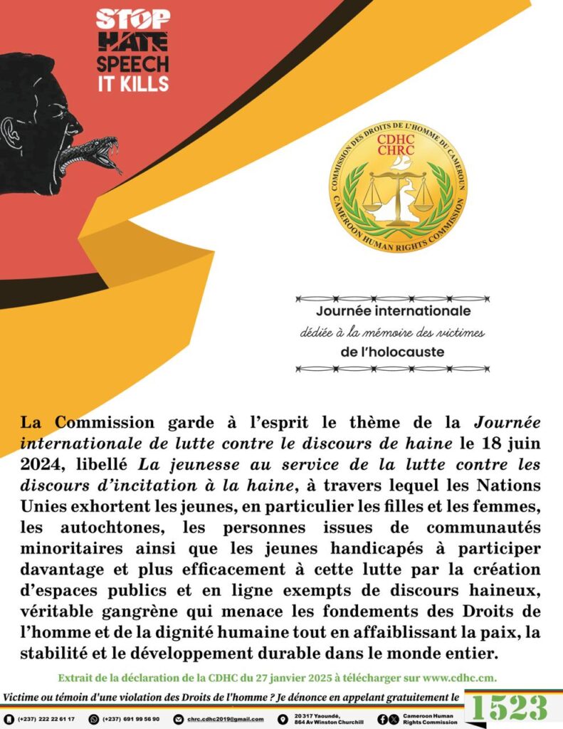 À l’occasion de la 20e édition de la Journée Internationale dédiée à la mémoire des victimes de l’Holocauste, la Commission des droits de l’homme du Cameroun (CDHC) sous l’impulsion de son Président Pr James MOUANGUE KOBILA Agrégé en Droit Public, appelle à une réflexion collective sur les leçons à tirer de cette tragédie humaine. Le thème de cette année, « La mémoire et l’enseignement de l’Holocauste pour la dignité et les Droits humains », met en lumière l’importance de préserver la mémoire des souffrances passées pour mieux protéger les valeurs universelles des droits de l’homme aujourd’hui. À travers une série de visuels de sensibilisation, la Commission invite à un engagement fort contre l’intolérance, la haine et l’injustice, en soulignant le rôle crucial de l’éducation et de la transmission de l’histoire pour construire un avenir plus respectueux de la dignité humaine.