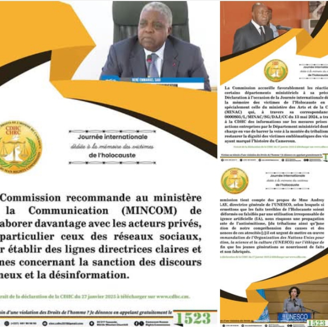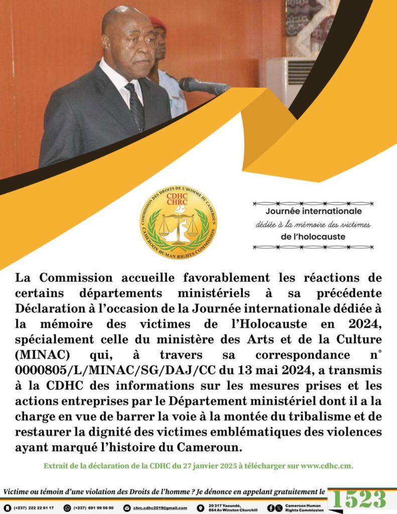 La Commission accueille favorablement les réactions de certains Départements Ministériels à sa précédente Déclaration à l’occasion de la Journée internationale dédiée à la mémoire des victimes de l’Holocauste en 2024, spécialement celle du ministère des Arts et de la Culture (MINAC) qui, à travers sa correspondance n° 0000805/L/MINAC/SG/DAJ/CC du 13 mai 2024, a transmis à la CDHC des informations sur les mesures prises et les actions entreprises par le Département ministériel dont il a la charge en vue de barrer la voie à la montée du tribalisme et de restaurer la dignité des victimes emblématiques des violences ayant marqué l’histoire du Cameroun.