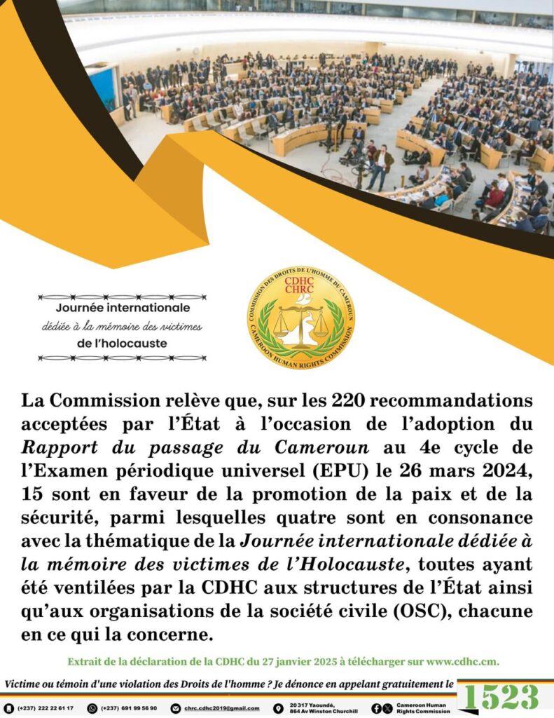 La Commission relève que, sur les 220 recommandations acceptées par l’État à l’occasion de l’adoption du Rapport du passage du Cameroun au 4e cycle de l’Examen périodique universel (EPU) le 26 mars 2024, 15 sont en faveur de la promotion de la paix et de la sécurité, parmi lesquelles quatre sont en consonance avec la thématique de la Journée internationale dédiée à la mémoire des victimes de l’Holocauste , toutes ayant été ventilées par la CDHC aux structures de l’État ainsi qu’aux organisations de la société civile (OSC), chacune en ce qui la concerne.