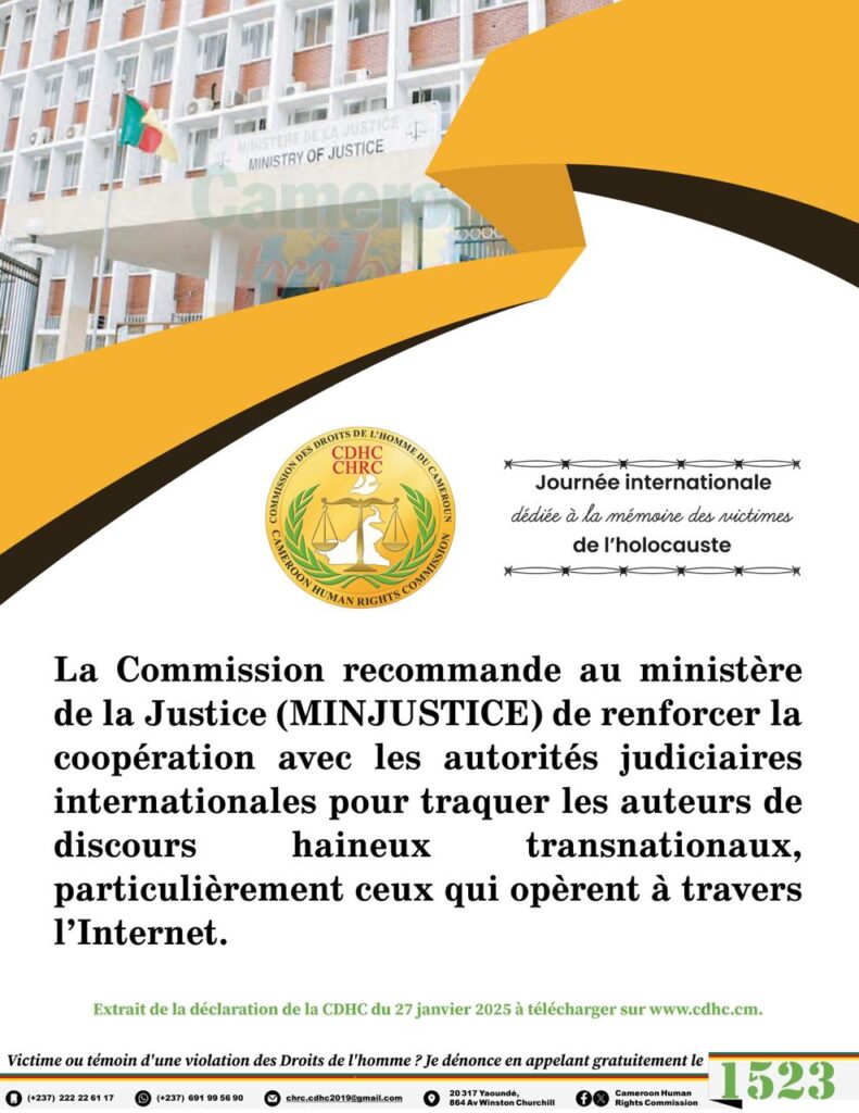 La Commission recommande au ministère de la Justice (MINJUSTICE) de renforcer la coopération avec les autorités judiciaires internationales pour traquer les auteurs de discours haineux transnationaux, particulièrement ceux qui opèrent à travers l’Internet.
