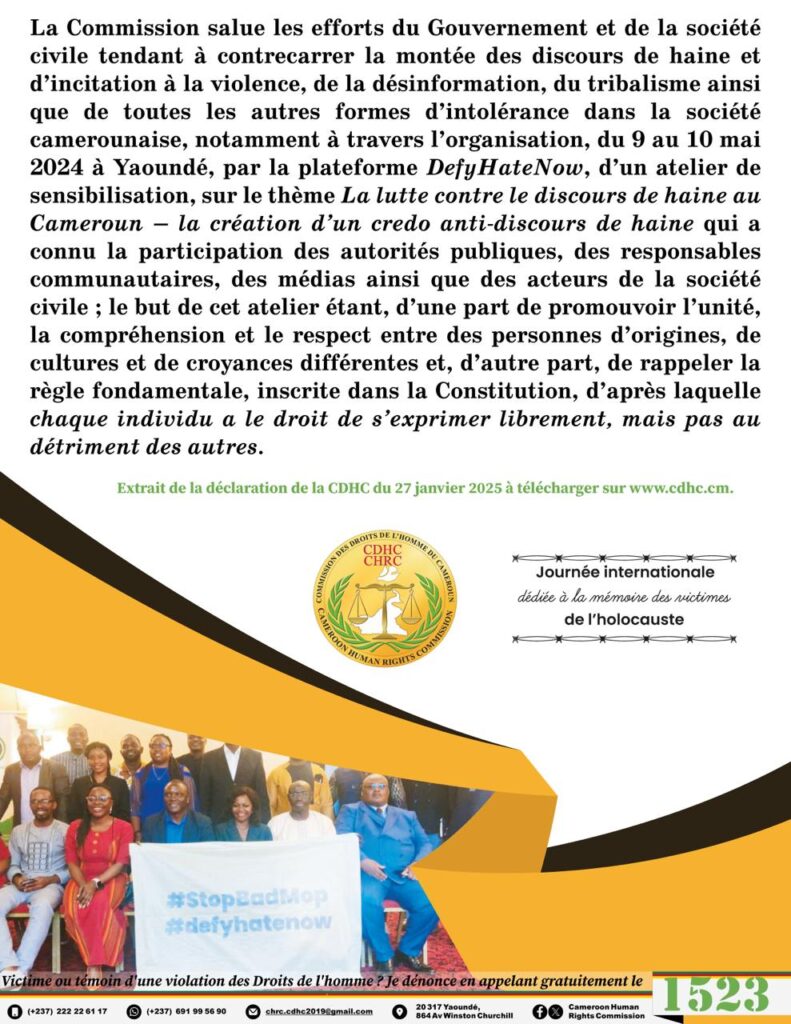 La Commission salue les efforts du Gouvernement et de la société civile tendant à contrecarrer la montée des discours de haine et d’incitation à la violence, de la désinformation, du tribalisme ainsi que de toutes les autres formes d’intolérance dans la société camerounaise, notamment à travers l’organisation, du 9 au 10 mai 2024 à Yaoundé, par la plateforme DefyHateNow , d’un atelier de sensibilisation, sur le thème La lutte contre le discours de haine au Cameroun la création d’un credo anti-discours de haine qui a connu la participation des autorités publiques, des responsables communautaires, des médias ainsi que des acteurs de la société civile ; le but de cet atelier étant, d’une part de promouvoir l’unité, la compréhension et le respect entre des personnes d’origines, de cultures et de croyances différentes et, d’autre part, de rappeler la règle fondamentale, inscrite dans la Constitution, d’après laquelle chaque individu a le droit de s’exprimer librement, mais pas au détriment des autres.