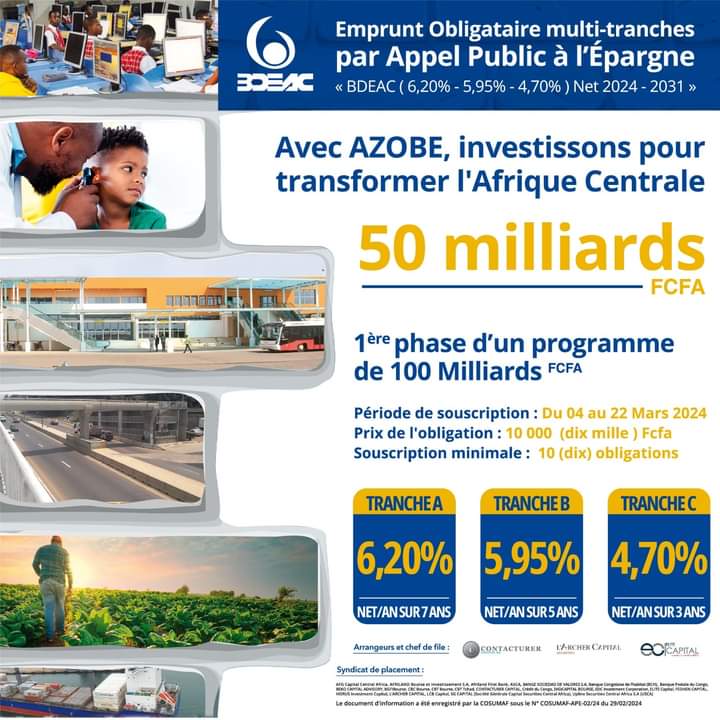 Cette Opération Dénommée Emprunt Obligataire Multi-Tranches Par Appel Public A L’épargne « BDEAC (6,20% – 5,95% – 4,70%) Net 2024 – 2031 » est la première phase d’un programme de 100 Milliards de FCFA.