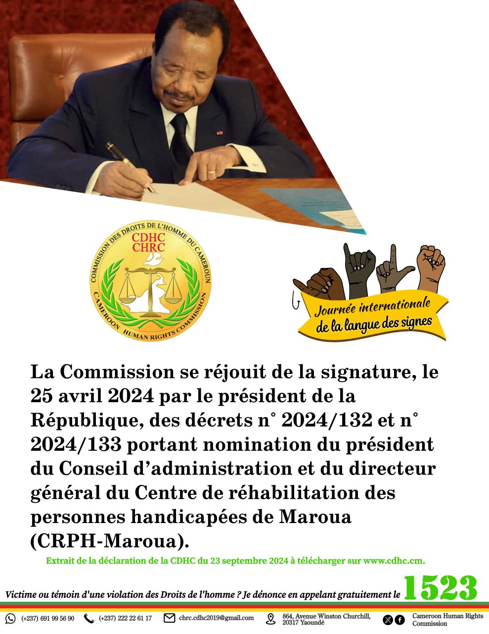 La Commission se réjouit de la signature, le 25 avril 2024 par le président de la République, des décrets n° 2024/132 et n° 2024/133 portant nomination du président du Conseil d’administration et du directeur général du Centre de réhabilitation des personnes handicapées de Maroua (CRPH-Maroua).