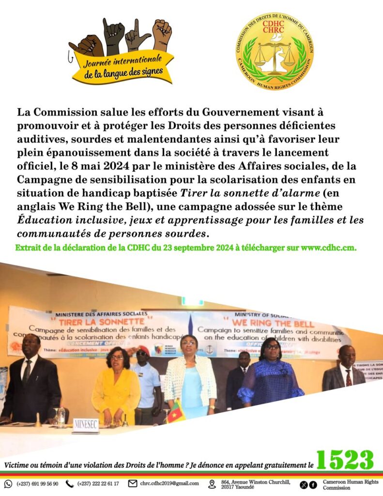 La Commission des Droits de l’Homme du Cameroun (CDHC), à l’occasion de la 7e édition de la Journée Internationale des Langues des Signes célébrée ce lundi 23 septembre 2024, a publié une déclaration sous le thème « Inscrivez-vous pour les Droits à la langue des signes ».