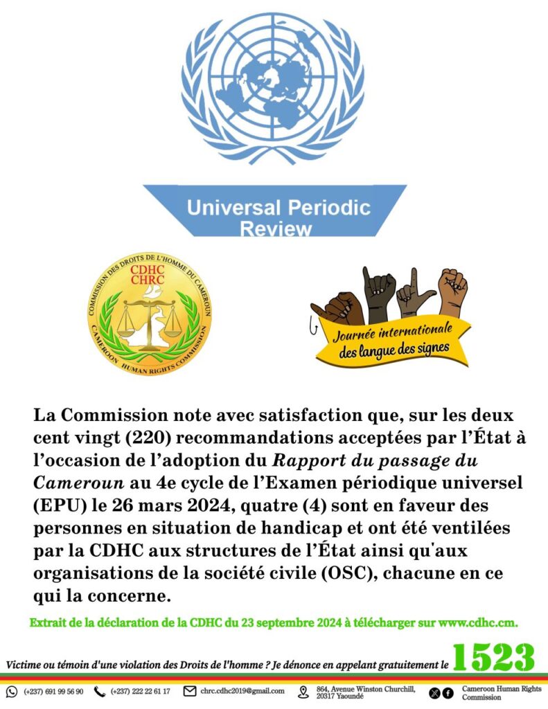 La Commission note avec satisfaction que, sur les deux cent vingt (220) recommandations acceptées par l’État à l’occasion de l’adoption du Rapport du passage du Cameroun au 4e cycle de l’Examen périodique universel (EPU) le 26 mars 2024, quatre (4) sont en faveur des personnes en situation de handicap et ont été ventilées par la CDHC aux structures de l’État ainsi qu’aux organisations de la société civile (OSC), chacune en ce qui la concerne.