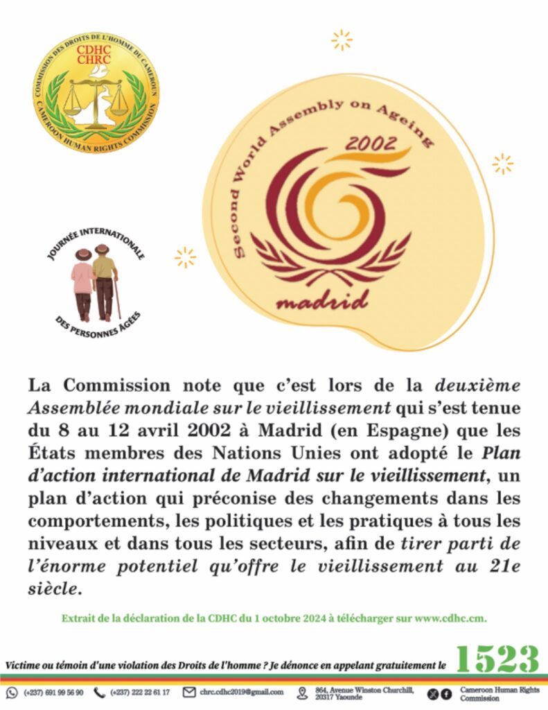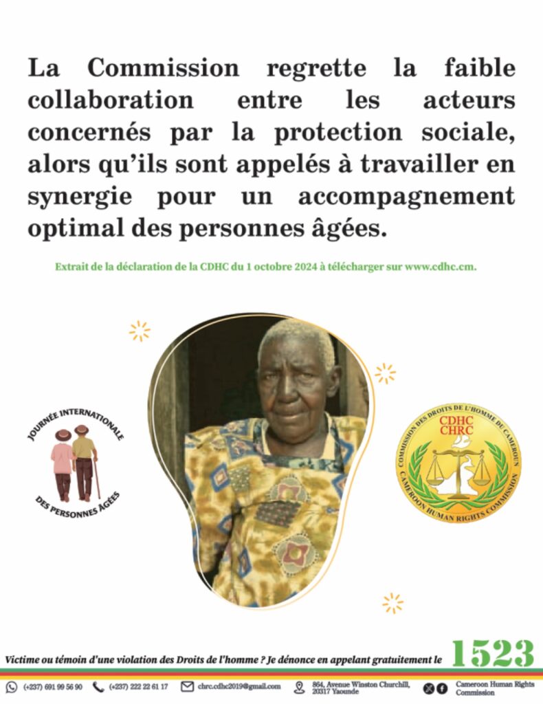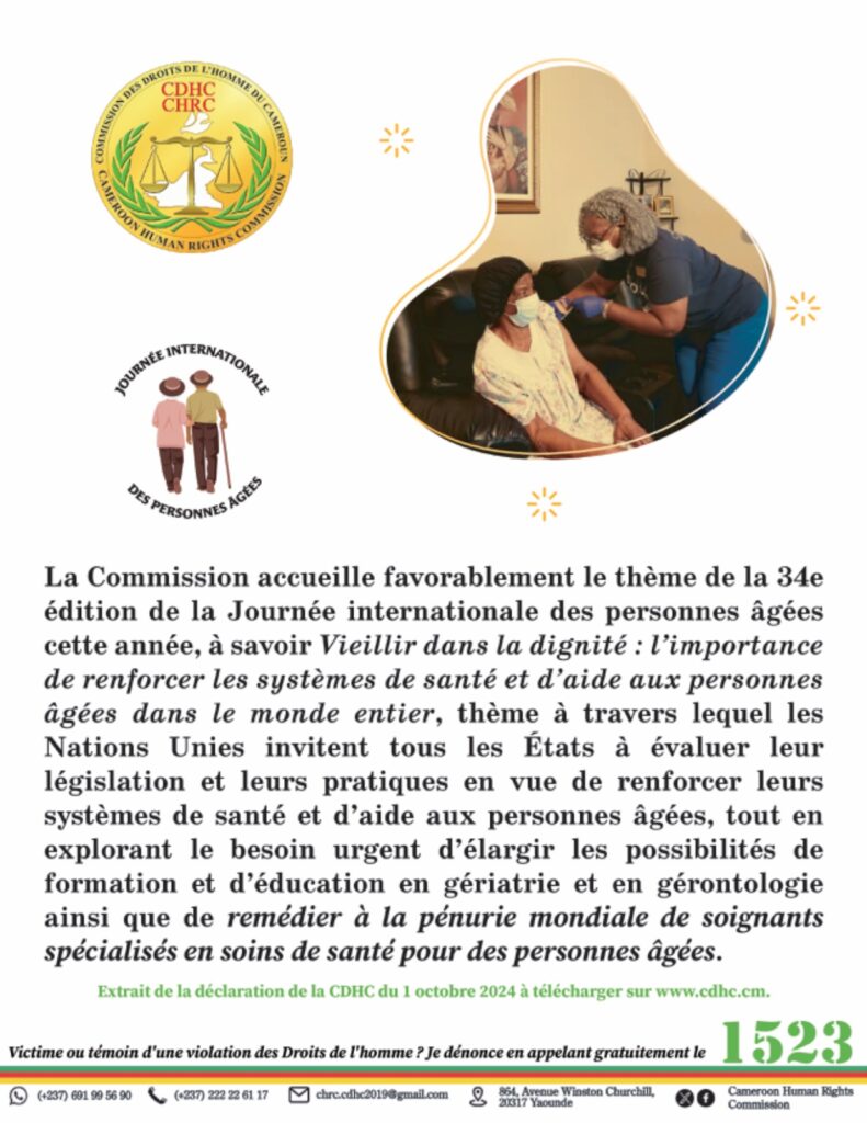Le 1er Octobre 2024, la Commission des Droits de l’Homme du Cameroun (CDHC), sous la présidence du Pr James MOUANGUE KOBILA, agrégé en Droit Public, a célébré la 7e édition de la Journée Internationale des Personnes Âgées. L’événement s’est déroulé sous le thème « Vieillir dans la dignité : l’importance de renforcer les systèmes de santé et d’aide aux personnes âgées dans le monde entier », mettant en lumière les défis croissants auxquels sont confrontées les personnes âgées, tant au Cameroun qu’à l’échelle mondiale.
