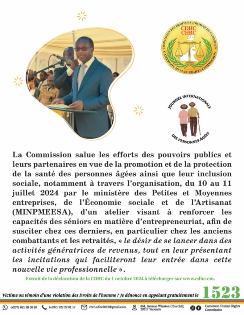La Commission salue les efforts des pouvoirs publics et de leurs partenaires en vue de la promotion et de la protection de la santé des personnes âgées ainsi que leur inclusion sociale, notamment à travers l’organisation, du 10 au 11 juillet 2024 par le ministère des Petites et Moyennes Entreprises, de l’Économie sociale et de l’Artisanat (MINPMEESA), d’un atelier visant à renforcer les capacités des séniors en matière d’entrepreneuriat, afin de susciter chez ces derniers, en particulier les anciens combattants et les retraités, « le désir de se lancer dans des activités génératrices de revenus, tout en leur présentant les incitations qui faciliteront leur entrée dans cette nouvelle vie professionnelle ».