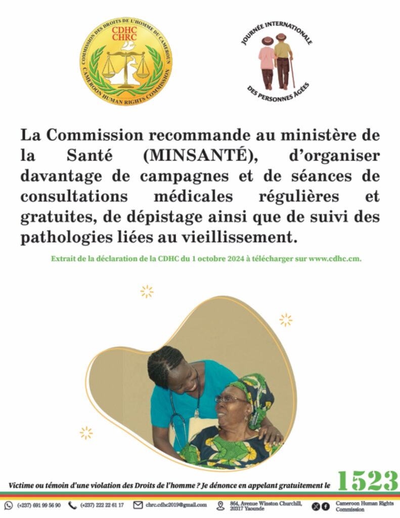 La Commission recommande au ministère de la Santé (MINSANTÉ), d’organiser davantage de campagnes et de séances de consultations médicales régulières et gratuites, de dépistage ainsi que de suivi des pathologies liées au vieillissement.