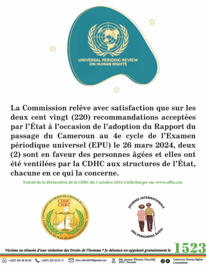 La Commission relève avec satisfaction que sur les deux cent vingt (220) recommandations acceptées par l’État à l’occasion de l’adoption du Rapport du passage du Cameroun au 4e cycle de l’Examen périodique universel (EPU) le 26 mars 2024, deux (2) sont en faveur des personnes âgées et elles ont été ventilées par la CDHC aux structures de l’État, chacune en ce qui la concerne.