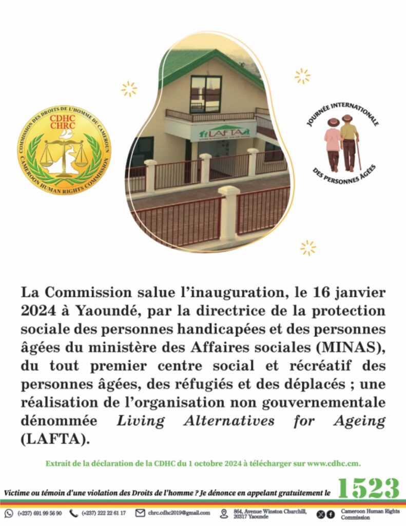 La Commission salue l’inauguration, le 16 janvier 2024 à Yaoundé, par la directrice de la protection sociale des personnes handicapées et des personnes âgées du ministère des Affaires sociales (MINAS), du tout premier centre social et récréatif des personnes âgées, des réfugiés et des déplacés ; initiative de l’organisation non gouvernementale dénommée Living Alternatives for Ageing (LAFTA).