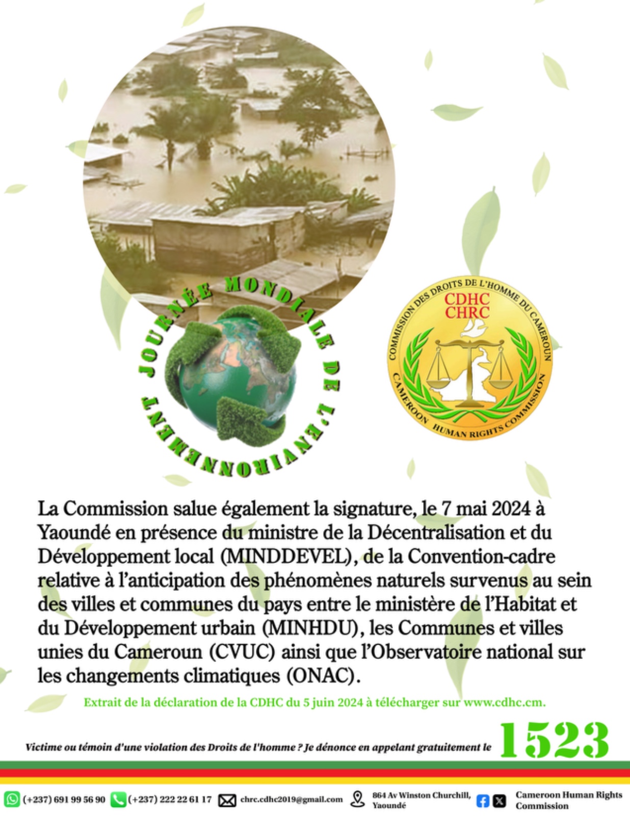 « La Commission salue également la signature, le 7 mai 2024 à Yaoundé en présence du ministre de la Décentralisation et du Développement local (MINDDEVEL), de la Convention-cadre relative à l’anticipation des phénomènes naturels survenus au sein des villes et communes du pays entre le ministère de l’Habitat et du Développement urbain (MINHDU), les Communes et villes unies du Cameroun (CVUC) ainsi que l’Observatoire national sur les changements climatiques (ONAC). »