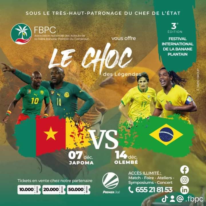 L’objectif ? Assurer la Nation Camerounaise que la Troisième Fête Internationale de la Banane-Plantain, placée sous le Haut Patronage de Paul Biya, va accueillir des activités d’envergure, dont deux matchs de gala historiques contre le Brésil. Ces rencontres se tiendront au Stade Japoma de Douala le 7 Décembre et au Stade Olembé de Yaoundé le 14 Décembre.
