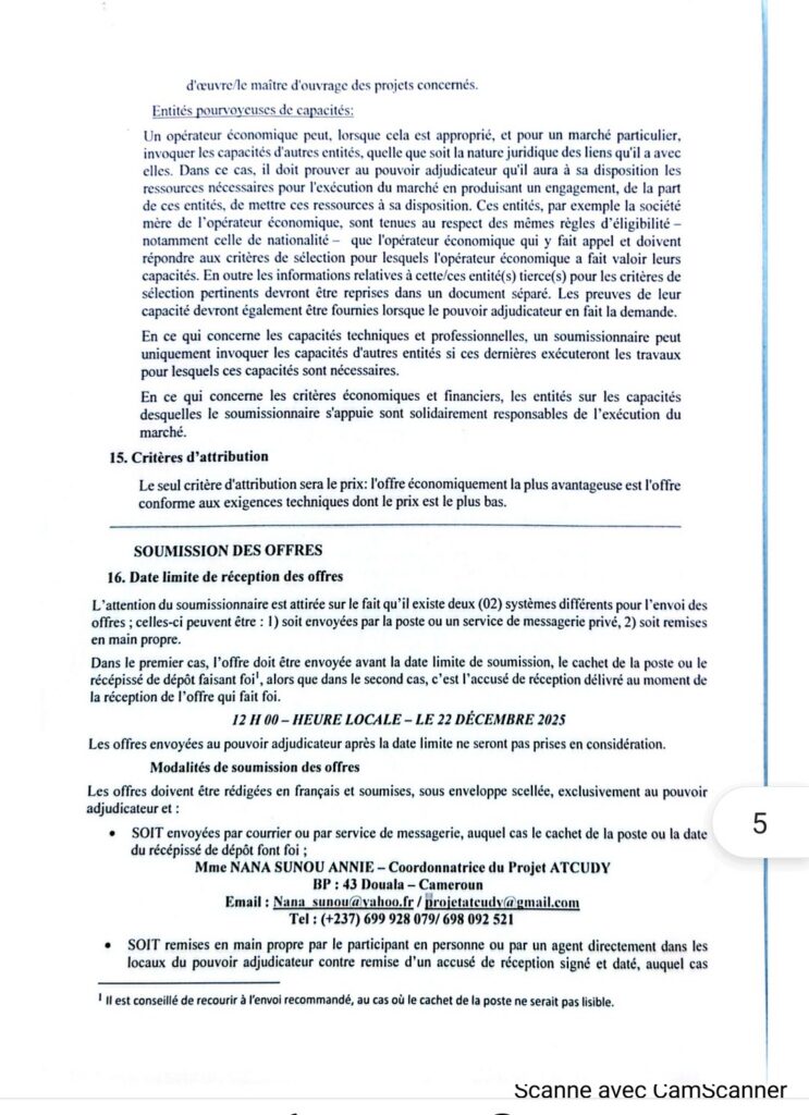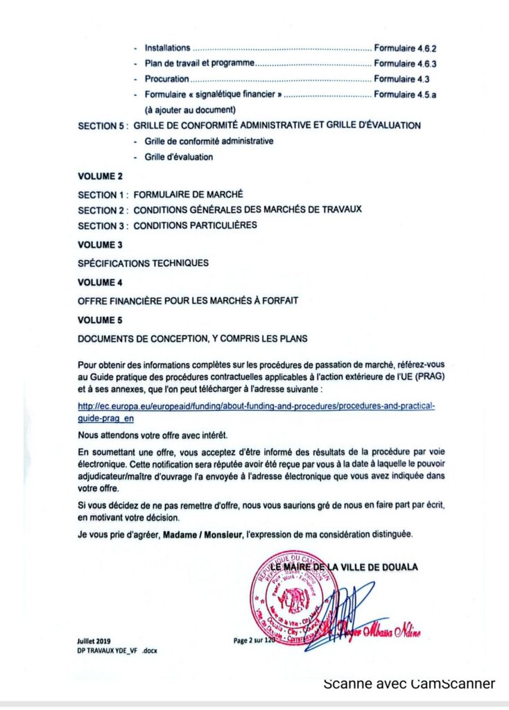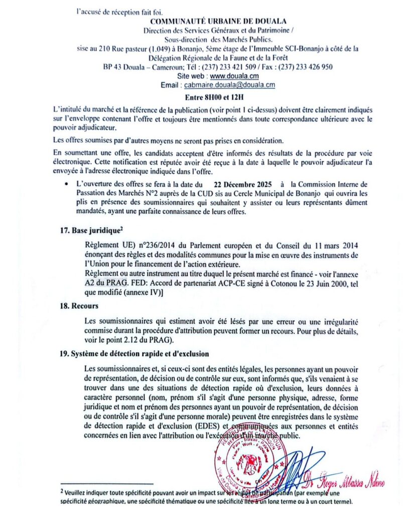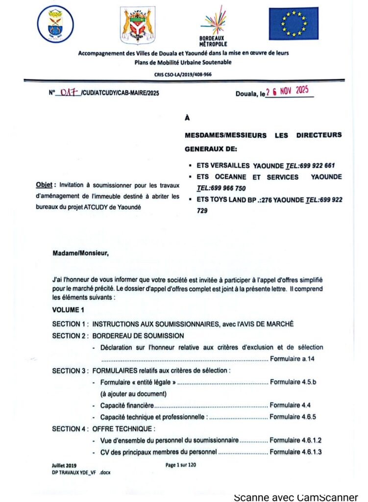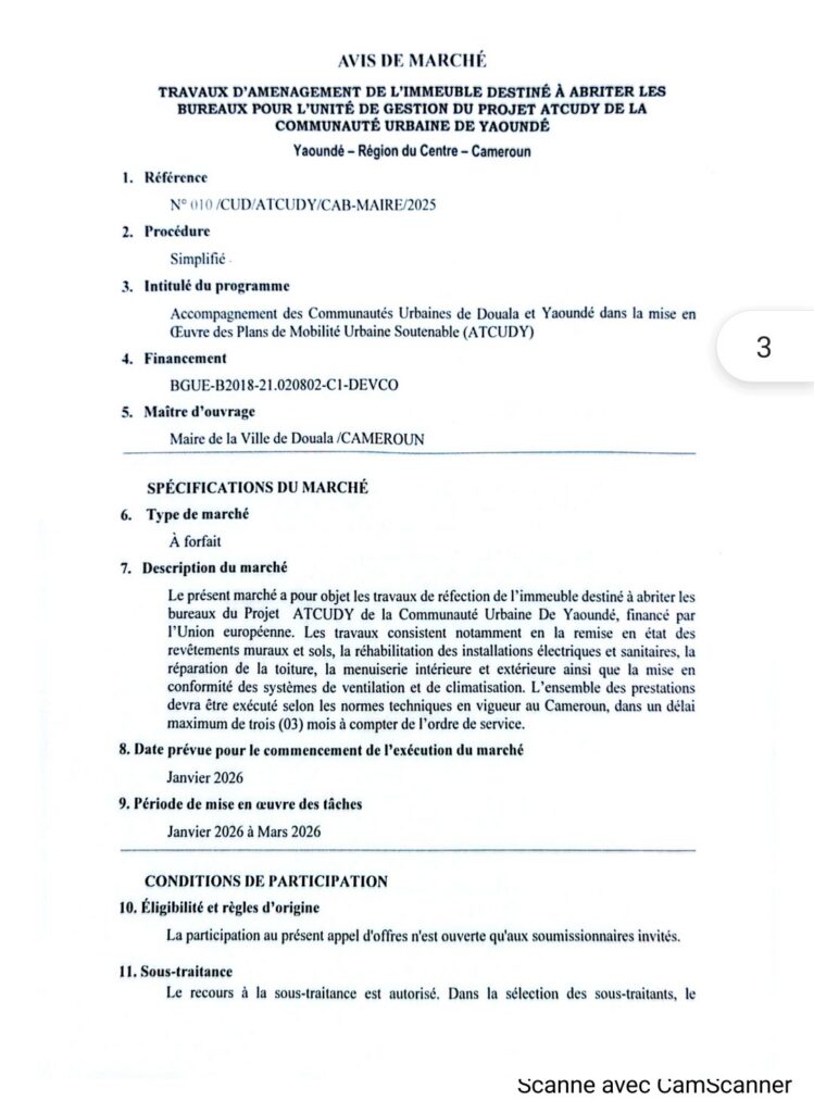 Dans le cadre de la mise en œuvre du Projet d’Accompagnement des Villes de Douala et Yaoundé dans leurs Plans de Mobilité Urbaine Soutenable (ATCUDY), financé par l’Union européenne, la Communauté Urbaine de Douala lance une procédure de consultation en vue de la réalisation des travaux d’aménagement de l’immeuble destiné à abriter les bureaux de l’Unité de gestion du projet à Yaoundé.