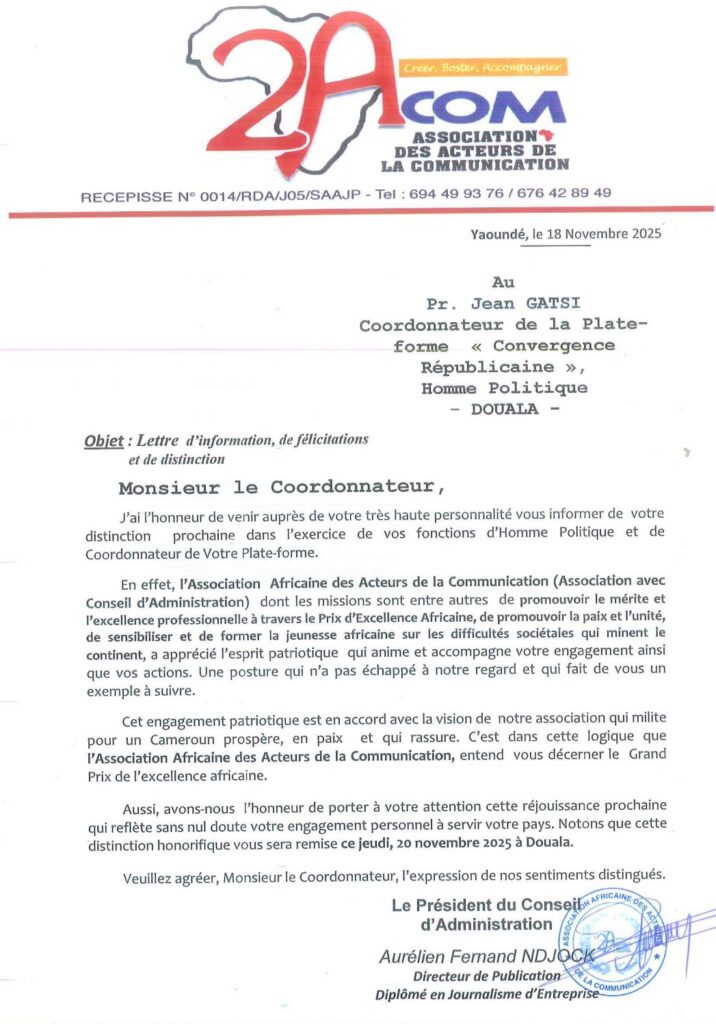 Dans la lettre officielle adressée au Coordonnateur, lu séance tenante par le Secrétaire général de l’association , elle souligne que les actions du Pr Gatsi « incarnent l’esprit patriotique, la vision d’un Cameroun prospère, en paix et rassurant ». Elle précise que son engagement et ses initiatives en faveur de la jeunesse et de la stabilité nationale ont retenu l’attention du Conseil d’Administration.