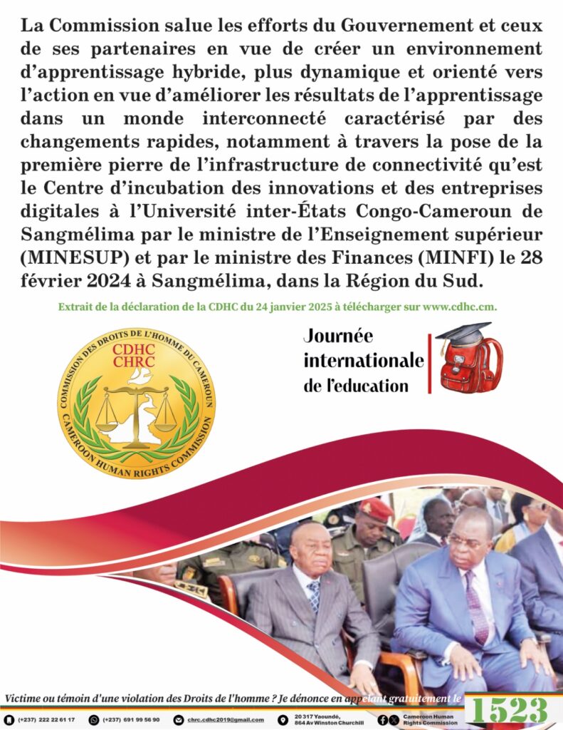 La Commission salue les efforts du Gouvernement et ceux de ses partenaires en vue de créer un environnement d’apprentissage hybride, plus dynamique et orienté vers l’action en vued’améliorer les résultats de l’apprentissage dans un monde interconnecté caractérisé par des changements rapides, notamment à travers la pose de la première pierre de l’infrastructure de connectivité qu’est le Centre d’incubation des innovations et des entreprises digitales à l’Université inter-États Congo-Cameroun de Sangmélima par le ministre de l’Enseignement supérieur (MINESUP) et par le ministre des Finances (MINFI) le 28 février 2024 à Sangmélima, dans la Région du Sud.