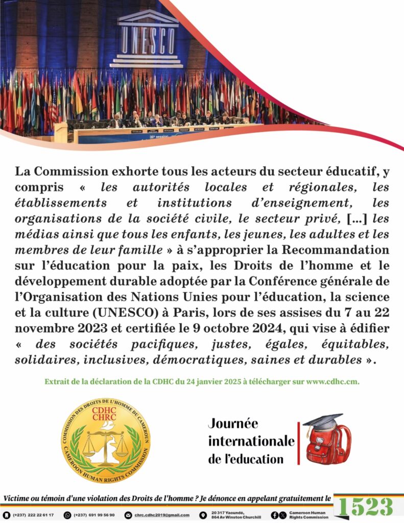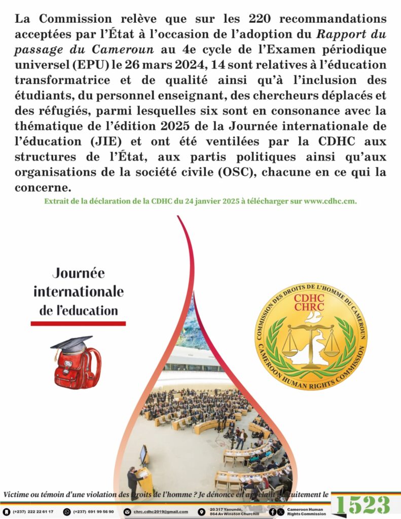 La Commission relève que sur les 220 recommandations acceptées par l’État à l’occasion de l’adoption du Rapport du passage du Cameroun au 4e cycle de l’Examen périodique universel (EPU) le 26 mars 2024, 14 sont relatives à l’éducation transformatrice et de qualité ainsi qu’à l’inclusion des étudiants, du personnel enseignant, des chercheurs déplacés, des réfugiés et des autres apprenants parmi lesquelles six sont en consonance avec la thématique de l’édition 2025 de la Journée internationale de l’éducation (JIE) et ont été ventilées par la CDHC aux structures de l’État, aux partis politiques ainsi qu’aux organisations de la société civile (OSC), chacune en ce qui la concerne.