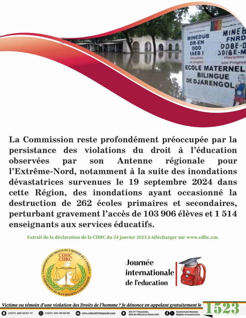 La Commission reste profondément préoccupée par la persistance des violations du droit à l’éducation observées par son Antenne régionale pour l’Extrême-Nord, notamment à la suite des inondations dévastatrices survenues le 19 septembre 2024 dans cette Région, des inondations ayant occasionné la destruction de 262 écoles primaires et secondaires, perturbant gravement l’accès de 103 906 élèves et 1 514 enseignants aux services éducatifs.