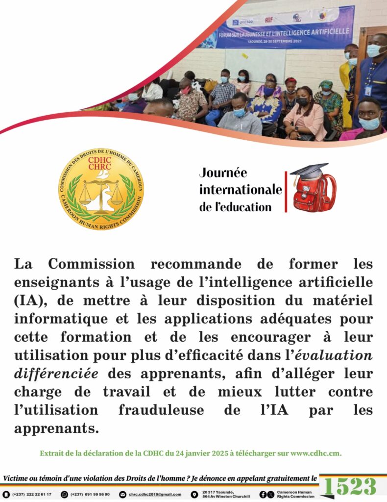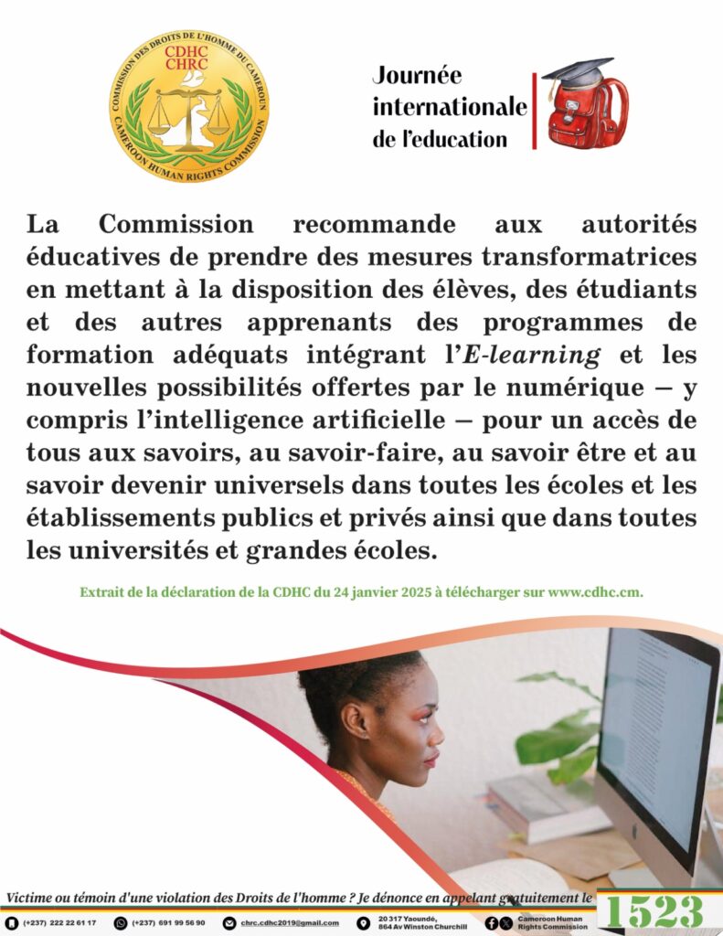 À l’occasion de la 7e édition de la Journée internationale de l’Éducation, célébrée le 24 janvier 2025, la Commission des droits de l’homme du Cameroun a souligné l’importance de concilier les avancées technologiques, notamment l’intelligence artificielle, avec les principes fondamentaux de l’éducation. Dans un contexte mondial marqué par une automatisation croissante, l’institution a insisté sur la nécessité de préserver l’autonomie des apprenants tout en exploitant le potentiel de ces nouvelles technologies pour enrichir l’enseignement et l’apprentissage. Ainsi, à cette occasion, elle a rendu publics des visuels afférents, illustrant les enjeux et les perspectives liés à l’intégration de l’IA dans les systèmes éducatifs.