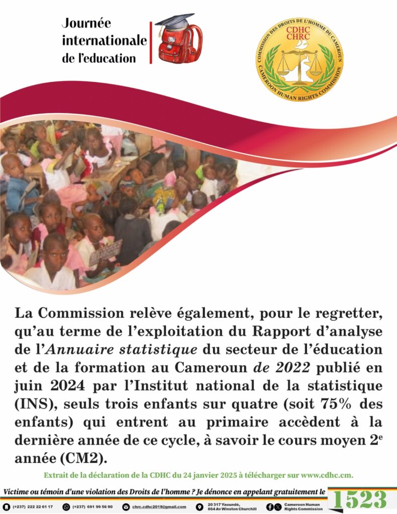 La Commission relève également, pour le regretter, qu’au terme de l’exploitation du Rapport d’analyse de l’Annuaire statistique du secteur de l’éducation et de la formation au Cameroun de 2022 publié en juin 2024 par l’Institut national de la statistique (INS), seuls trois enfants sur quatre (soit 75% des enfants) qui entrent au primaire accèdent à la dernière année de ce cycle, à savoir le cours moyen 2e année (CM2).