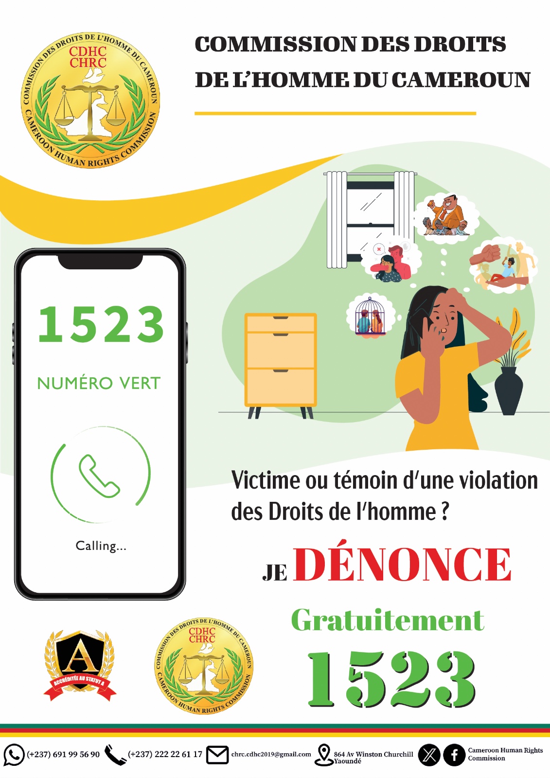 La Commission des Droits de l’Homme du Cameroun (CDHC) sous l’entremise à son Président le Pr James MOUANGUE KOBILA, Agrégé de Droit Public a mis en place un numéro vert, le 1523, pour permettre à toute personne victime ou témoin de violations des droits de l’homme de les signaler facilement.
